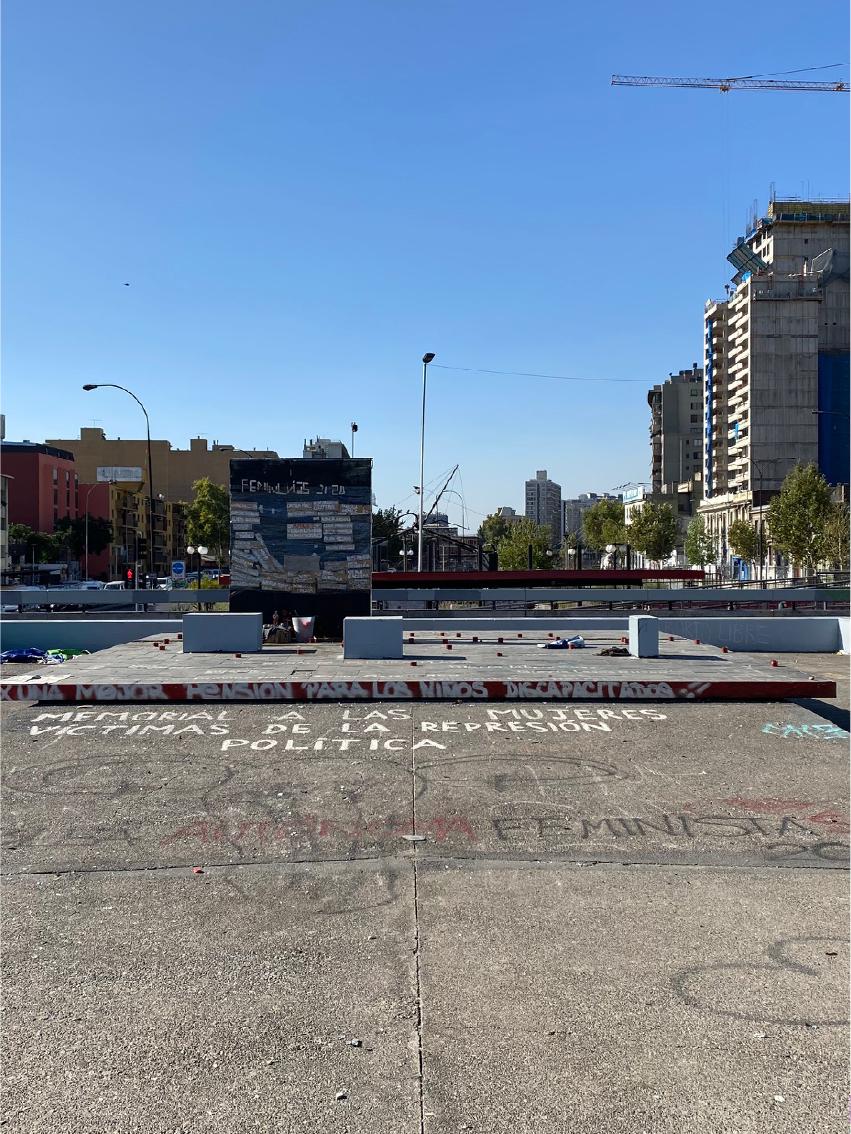 Un memorial pensado para quedarse: muro de vidrio, plataforma, bancas y candeleros sobre una rampa accesible. Resultado de un concurso público de 2004, fue diseñado para la permanencia del visitante y la reflexión colectiva sobre las violaciones a los derechos humanos cometidas contra mujeres durante la dictadura. Su deterioro actual también es parte de su biografía urbana.